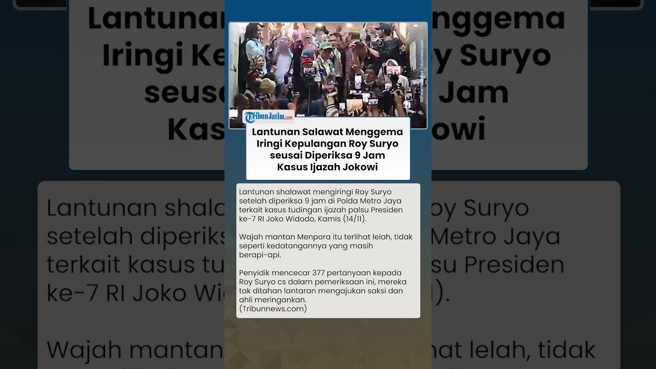 TRIBUN-VIDEO.COM - Lantunan shalawat mengiringi Roy Suryo setelah diperiksa 9 jam di Polda Metro Jaya terkait kasus tudingan ijazah palsu Presiden ke-7 RI Joko Widodo, Kamis (14/11).