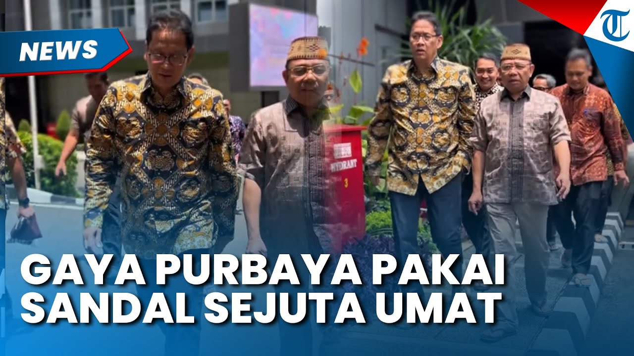 Gaya Purbaya menjadi sorotan karena penampilannya yang sederhana. Ia tampak mengenakan batik dan celana panjang kain serta sandal jepit berwarna hijau.