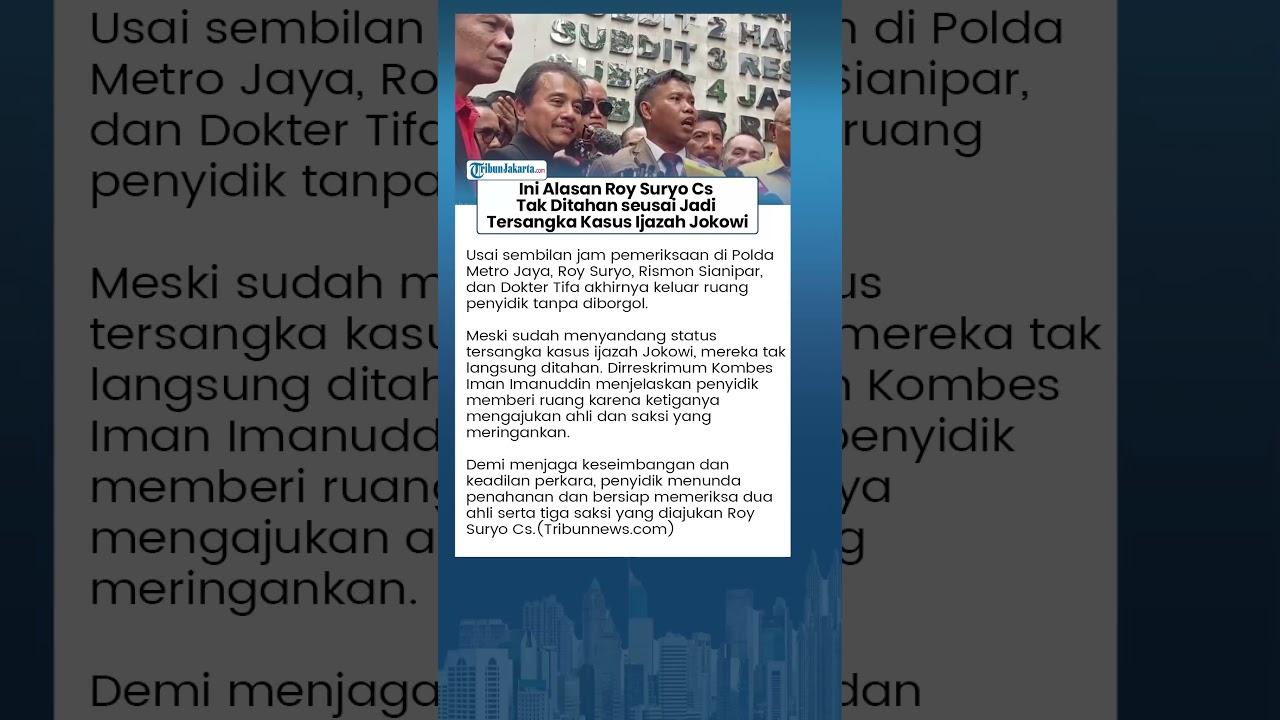 TRIBUN-VIDEO.COM - Roy Suryo, Rismon Sianipar, dan Tifauzia Tyassuma atau Dokter Tifa telah selesai menjalani pemeriksaan perdana mereka sebagai tersangka kasus ijazah Jokowi, di Polda Metro Jaya, Kamis (13/11/2025).