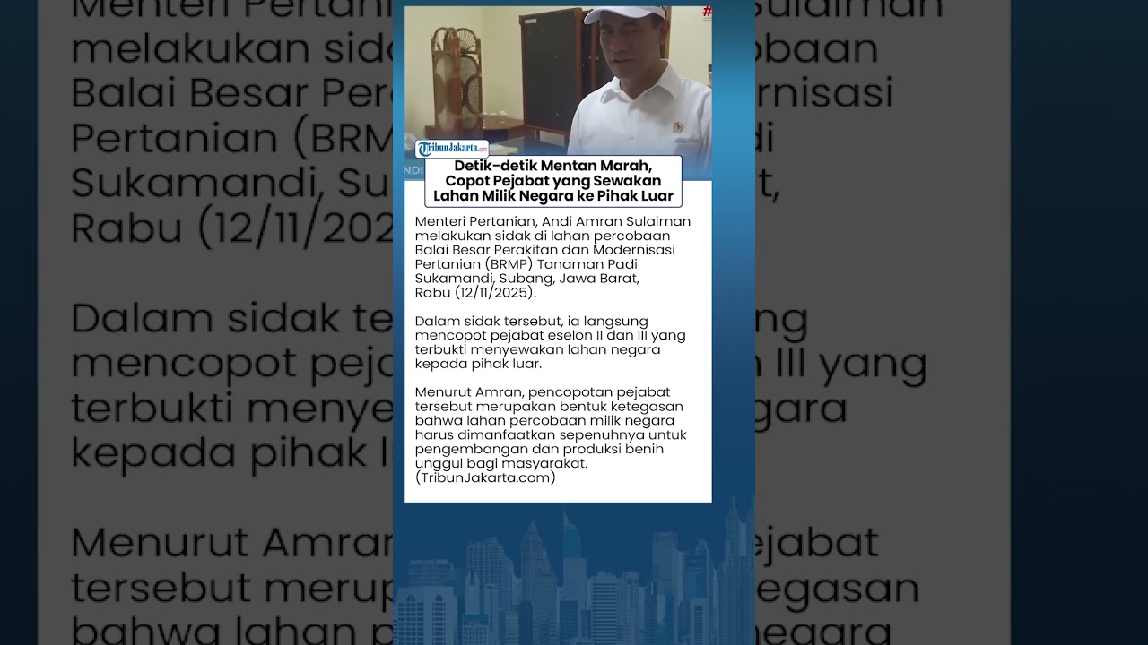 TRIBUN-VIDEO.COM - Menteri Pertanian, Andi Amran Sulaiman melakukan inspeksi mendadak (sidak) di lahan percobaan Balai Besar Perakitan dan Modernisasi Pertanian (BRMP) Tanaman Padi Sukamandi, Subang, Jawa Barat, Rabu (12/11/2025).