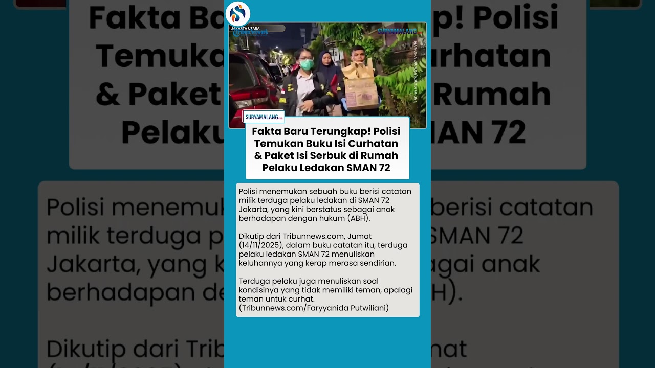 TRIBUN-VIDEO.COM - Polisi menemukan sebuah buku berisi catatan milik terduga pelaku ledakan di SMAN 72 Jakarta, yang kini berstatus sebagai anak berhadapan dengan hukum (ABH).