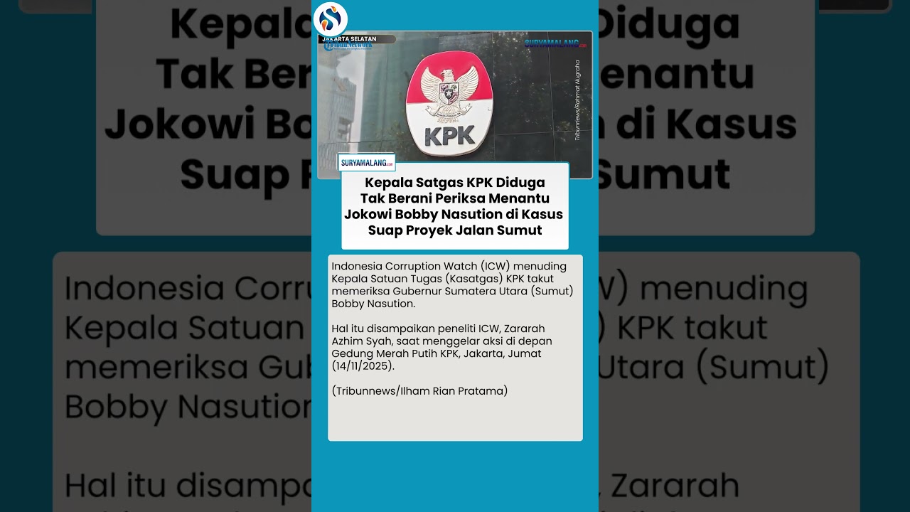 TRIBUN-VIDEO.COM - Indonesia Corruption Watch (ICW) menuding Kepala Satuan Tugas (Kasatgas) KPK takut memeriksa Gubernur Sumatera Utara (Sumut) Bobby Nasution.