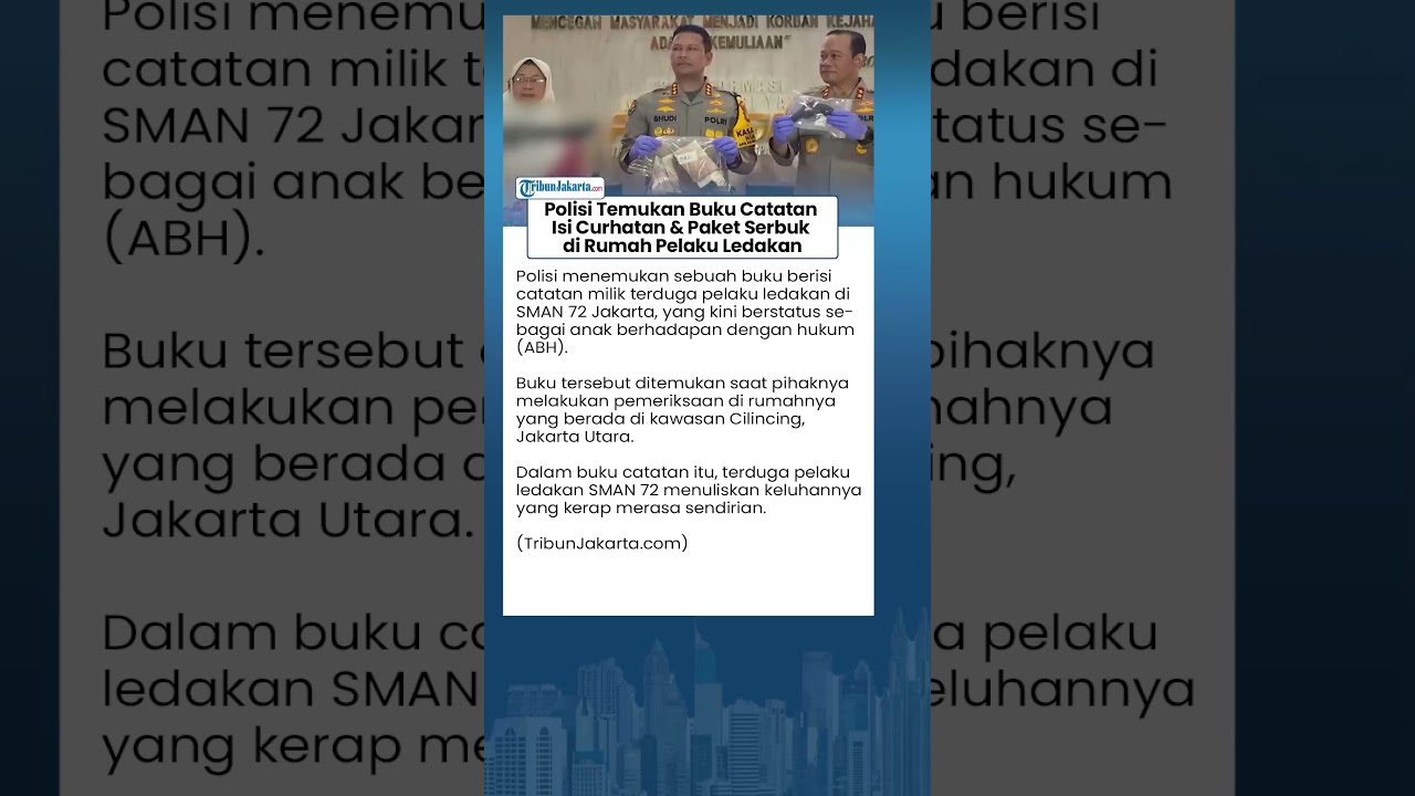 TRIBUN-VIDEO.COM - Polisi menemukan sebuah buku berisi catatan milik terduga pelaku ledakan di SMAN 72 Jakarta, yang kini berstatus sebagai anak berhadapan dengan hukum (ABH).