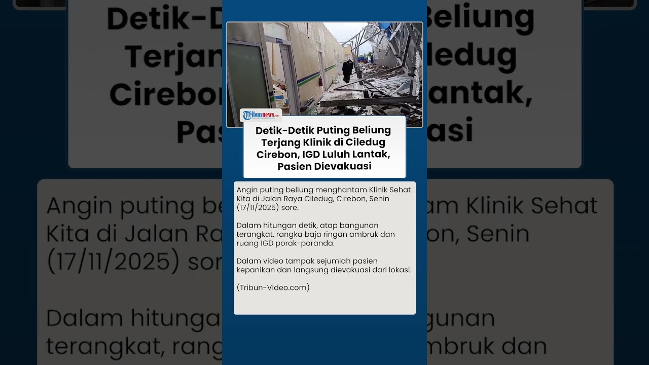 TRIBUN-VIDEO.COM - Angin puting beliung menghantam Klinik Sehat Kita di Jalan Raya Ciledug, Cirebon, Senin (17/11/2025) sore.
