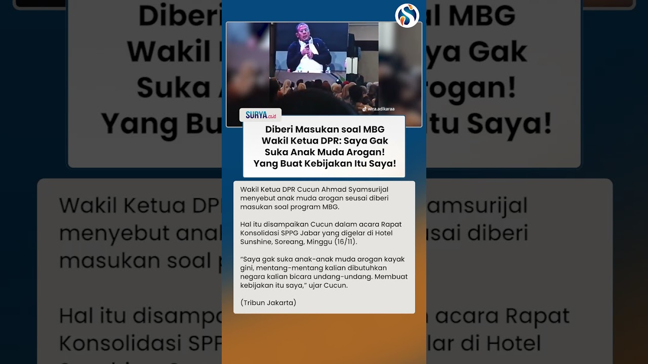 TRIBUN-VIDEO.COM - Wakil Ketua DPR Cucun Ahmad Syamsurijal menyebut anak muda arogan seusai diberi masukan soal program MBG.