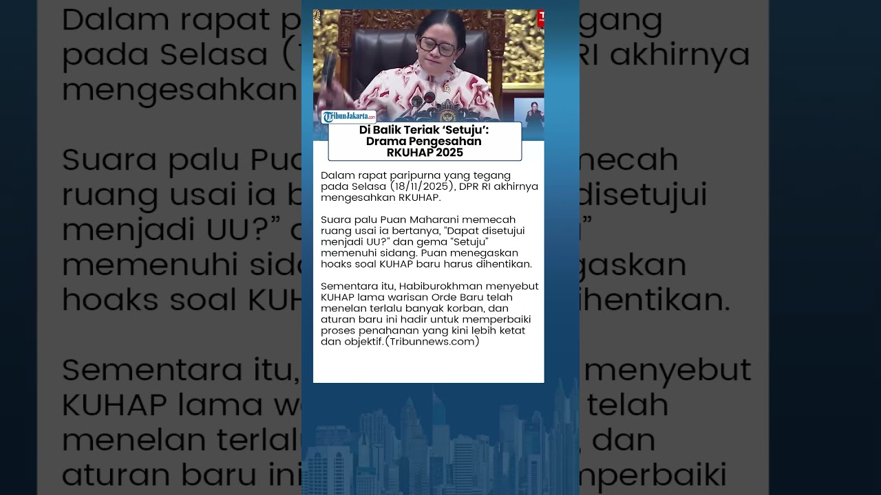 TRIBUN-VIDEO.COM - DPR RI resmi mengesahkan Rancangan Kitab Undang-Undang Hukum Acara Pidana (RKUHAP) dalam rapat paripurna pada Selasa (18/11/2025).