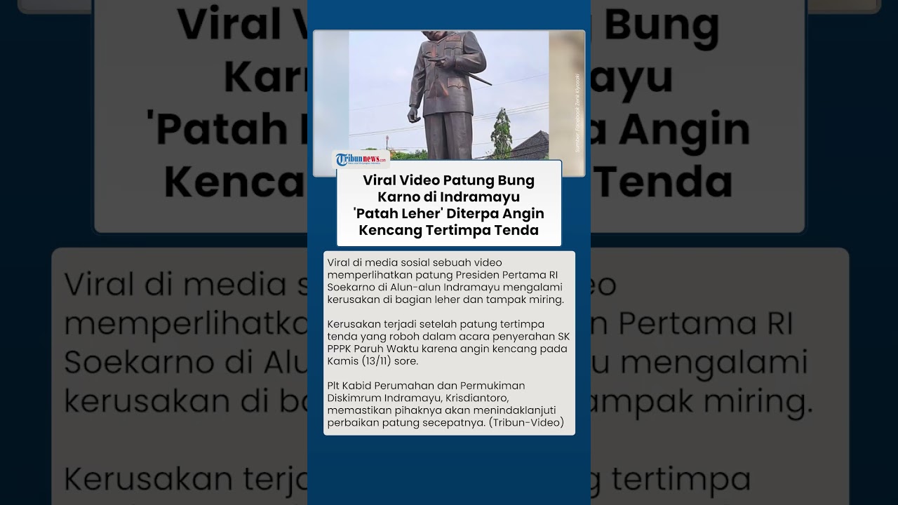 TRIBUN-VIDEO.COM - Viral di media sosial sebuah video memperlihatkan patung Presiden Pertama RI Soekarno di Alun-alun Indramayu mengalami kerusakan di bagian leher dan tampak miring.