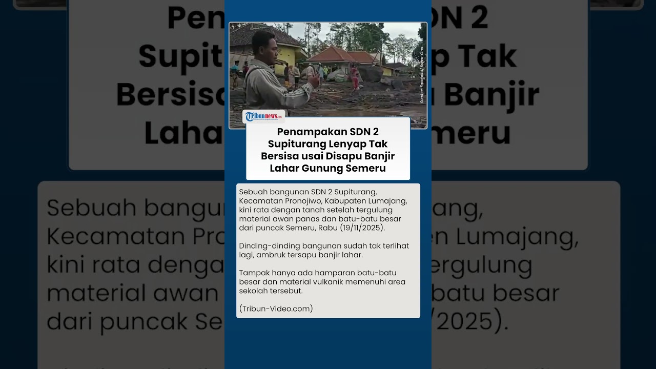 TRIBUN-VIDEO.COM - Sebuah bangunan SDN 2 Supiturang, Kecamatan Pronojiwo, Kabupaten Lumajang, kini rata dengan tanah setelah tergulung material awan panas dan batu-batu besar dari puncak Semeru, Rabu (19/11/2025).