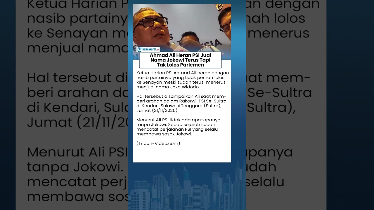 TRIBUN-VIDEO.COM - Ketua Harian Partai Solidaritas Indonesia (PSI) Ahmad Ali heran dengan nasib partainya yang tidak pernah lolos ke Senayan meski sudah terus-menerus menjual nama Presiden ke-7 RI Joko Widodo (Jokowi).