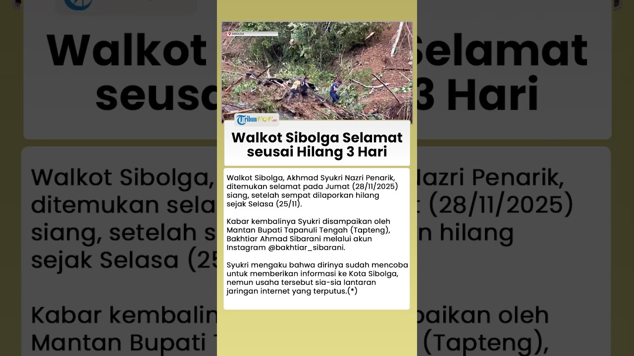 TRIBUN-VIDEO.COM - Wali Kota (Walkot) Sibolga, Akhmad Syukri Nazri Penarik, ditemukan selamat pada Jumat (28/11/2025) siang, setelah sempat dilaporkan hilang sejak Selasa (25/11).