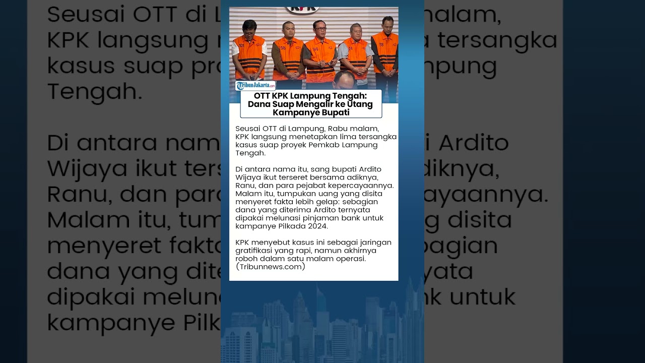TRIBUN-VIDEO.COM - Seusai Operasi Tangkap Tangan (OTT) di Lampung pada Rabu (11/12/2025), Komisi Pemberantasan Korupsi (KPK) menetapkan lima orang tersangka dalam kasus suap dan gratifikasi pengadaan proyek di lingkungan Pemkab Lampung Tengah, pada Kamis (11/12/2025).