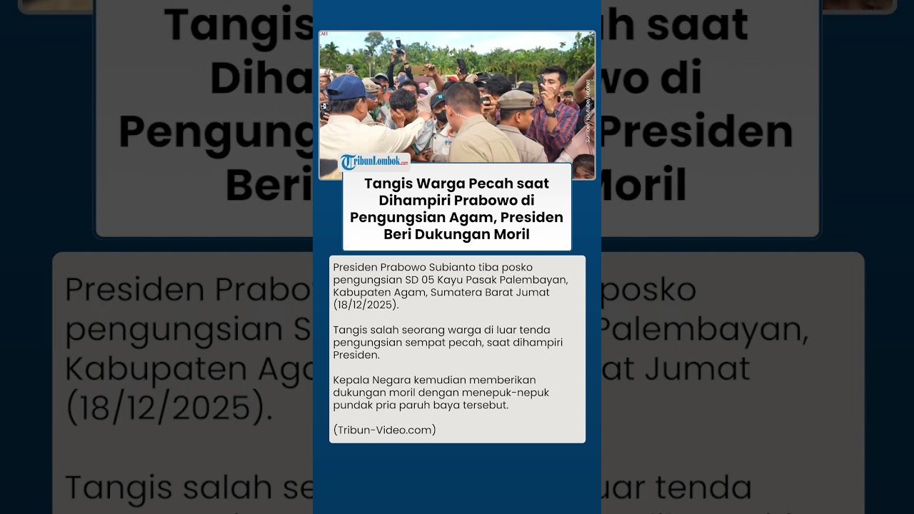 TRIBUN-VIDEO.COM -Presiden Prabowo Subianto tiba posko pengungsian SD 05 Kayu Pasak Palembayan, Kabupaten Agam, Sumatera Barat Jumat (18/12/2025).