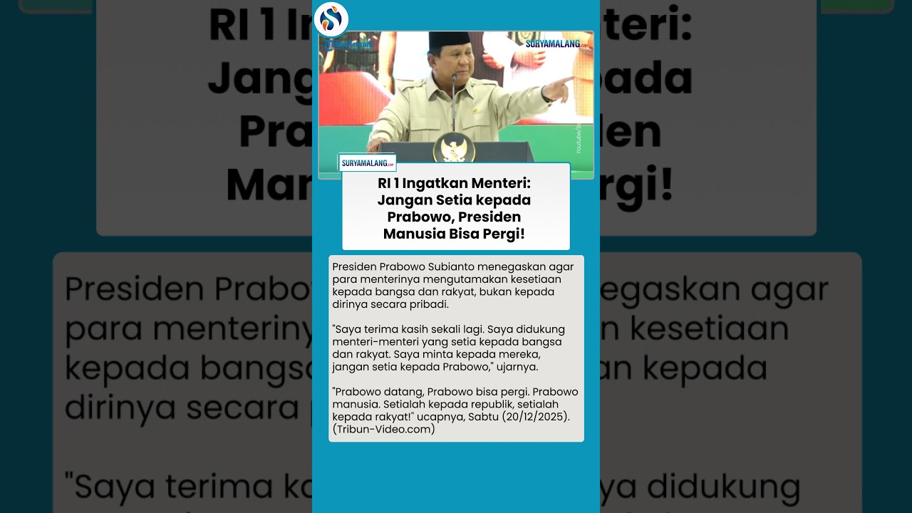 "Saya terima kasih sekali lagi, saya didukung menteri-menteri yang setia kepada bangsa dan rakyat. Saya minta ke mereka, jangan setia kepada Prabowo," kata Prabowo dalam acara akad massal 50.300 unit rumah subsidi di Perumahan Pondok Banten Indah, Serang, Banten, Sabtu (20/12/2025).