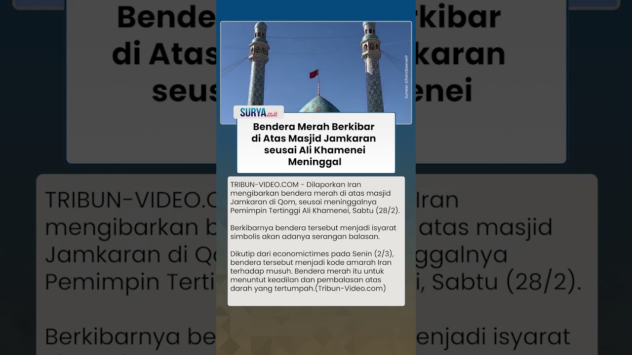 TRIBUN-VIDEO.COM - Iran mengibarkan bendera merah di atas kubah Masjid Jamkaran di kota suci Qom, pasca meninggalnya Pemimpin Tertinggi Ali Khamenei pada Sabtu (28/2/2026). Pengibaran bendera ini merupakan isyarat simbolis yang sangat kuat akan adanya serangan balasan masif dalam waktu dekat.