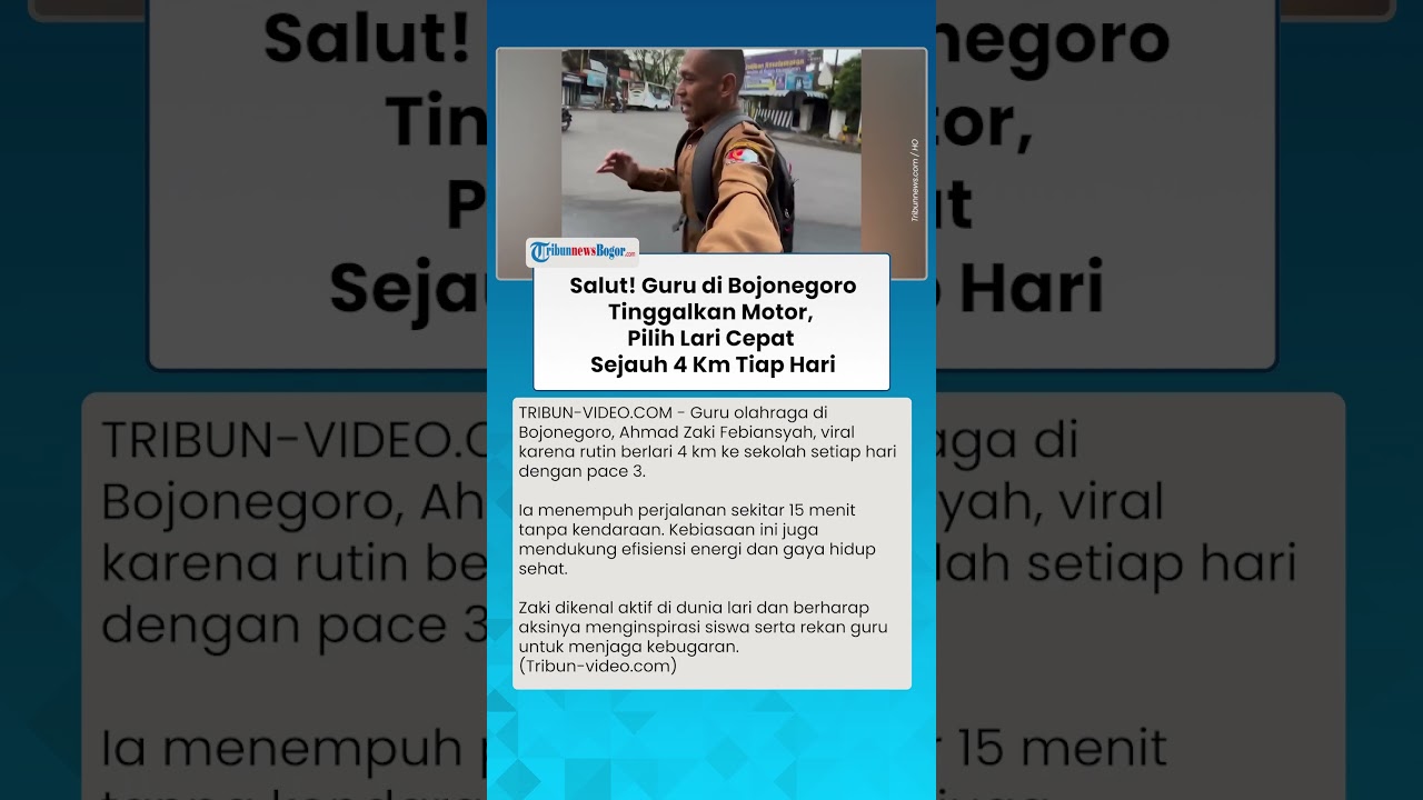 TRIBUN-VIDEO.COM - Seorang guru olahraga di Kabupaten Bojonegoro, Jawa Timur, menjadi sorotan setelah menjalani kebiasaan berangkat kerja tak biasa. Alih-alih menggunakan sepeda motor, ia memilih berlari sejauh 4 kilometer menuju sekolah tempatnya mengajar setiap hari.
