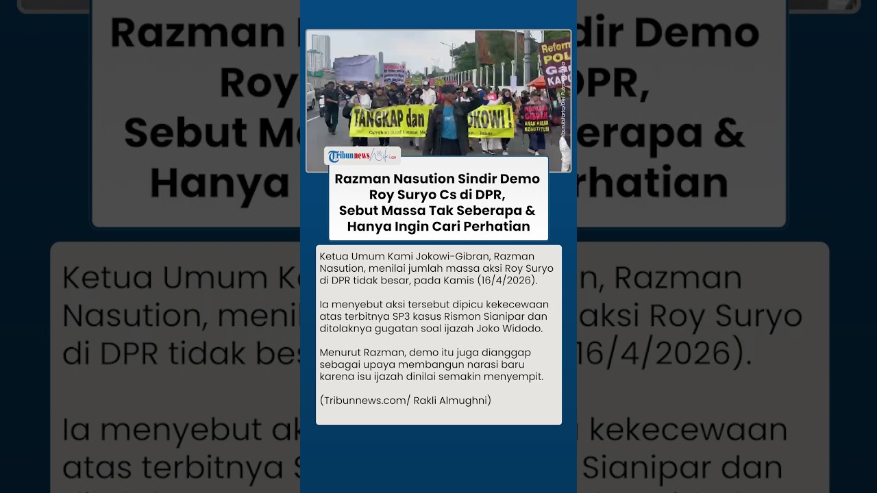 TRIBUN-VIDEO.COM - Ketua Umum Kami Jokowi-Gibran, Razman Nasution, menyoroti aksi demonstrasi yang dilakukan oleh Roy Suryo bersama massa di depan Gedung DPR/MPR RI, Jakarta, Kamis (16/4/2026).