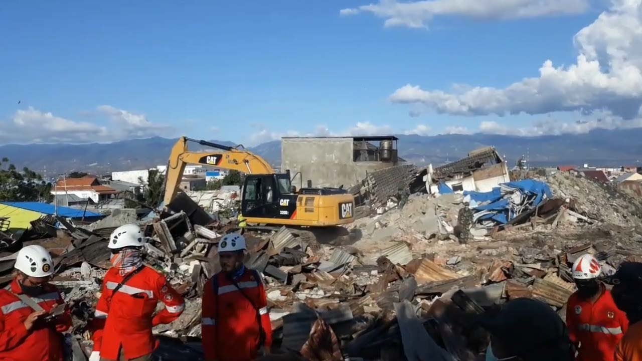 Mereka melakukan pencarian para korban yang tertimbun reruntuhan bangunan menggunakan enam alat berat eskavator pada Senin (8/10/2018).