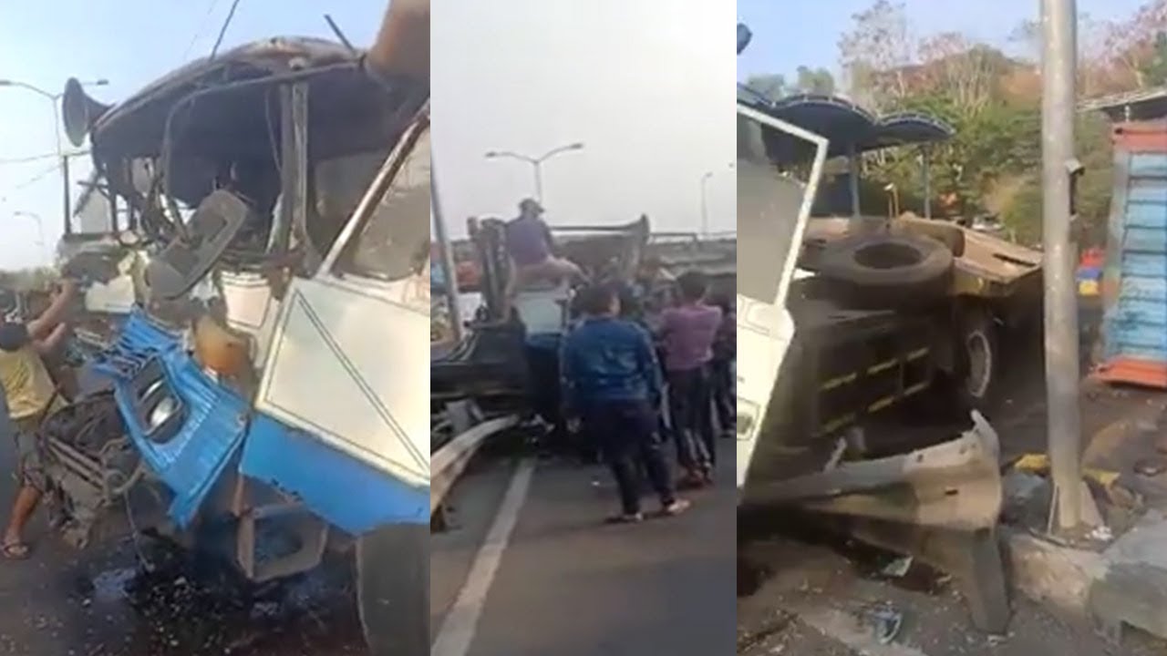TRIBUN-VIDEO.COM - Sebuah truk trailer beroda enam bernopol L 8765 UV tiba-tiba menghantam truk boks yang sopirnya tengah bertransaksi di pintu loket Jembatan Suramadu, Kamis (18/10/2018).