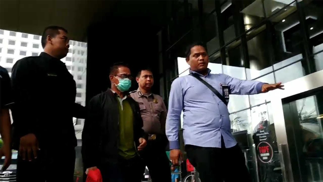 Pria yang mengenakan kaus polo hijau dibalut jaket kelir hitam itu turun dari sebuah mobil minibus dengan ditemani beberapa petugas KPK dan aparat kepolisian.