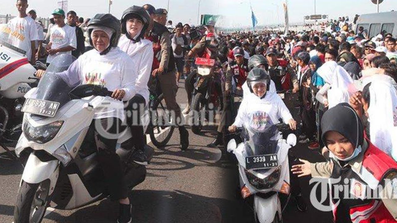 Khofifah membonceng istri Wagub Emil Elestianto Dardak itu dari Kantor Badan Pengembangan Wilayah Surabaya Madura (BPWS) hingga panggung utama di ujung Suramadu.