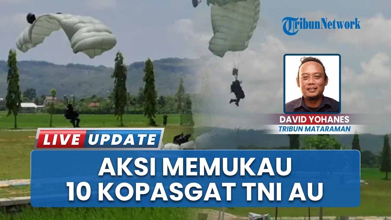 Pesawat terlihat melintas di atas kawasan persawahan, dan di ketinggian 10 penerjun Komando Pasukan Gerak Cepat (Kopasgat) TNI AU keluar dari badan pesawat.