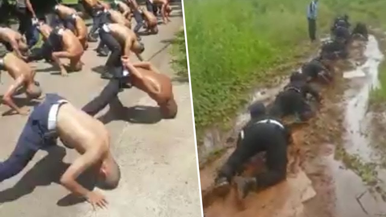 Mereka diberi perintah oleh seorang yang diduga pelatih untuk melebarkan kedua kaki dan meletakkan kepala di tanah sebagai tumpuan.