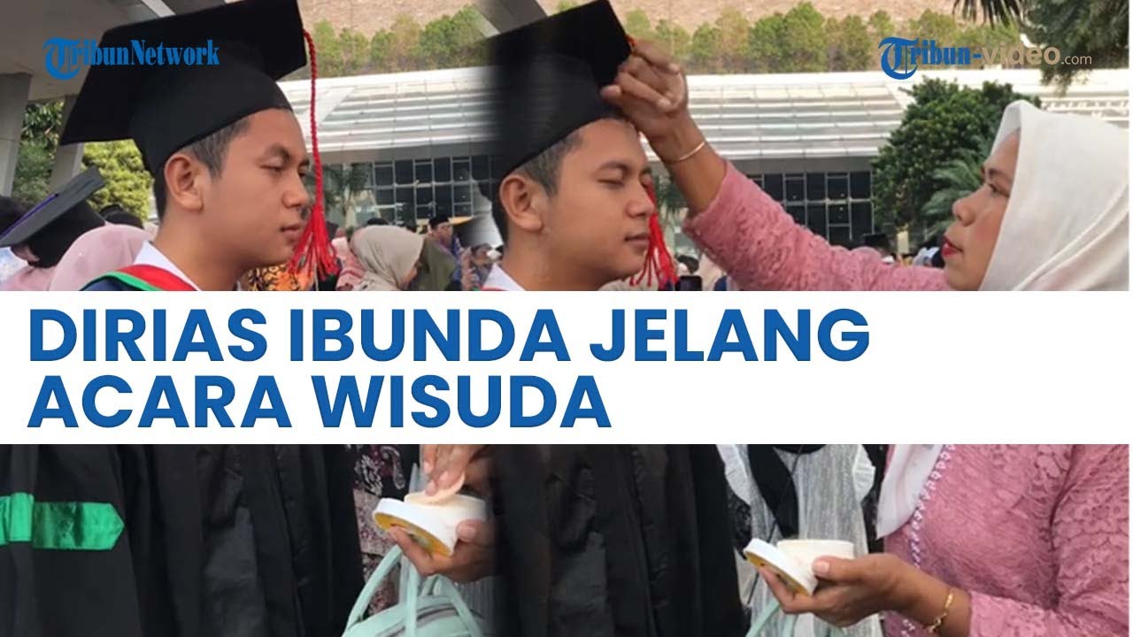 Mahasiswa yang diketahui bernama Achmad itu tampak sedang dirias oleh sang ibunda.