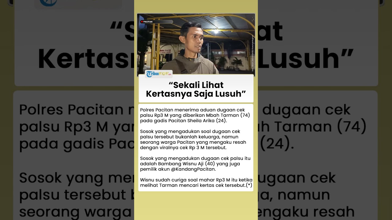TRIBUN-VIDEO.COM - Polres Pacitan menerima aduan dugaan cek palsu Rp3 M yang diberikan Mbah Tarman (74) pada gadis Pacitan Sheila Arika (24).